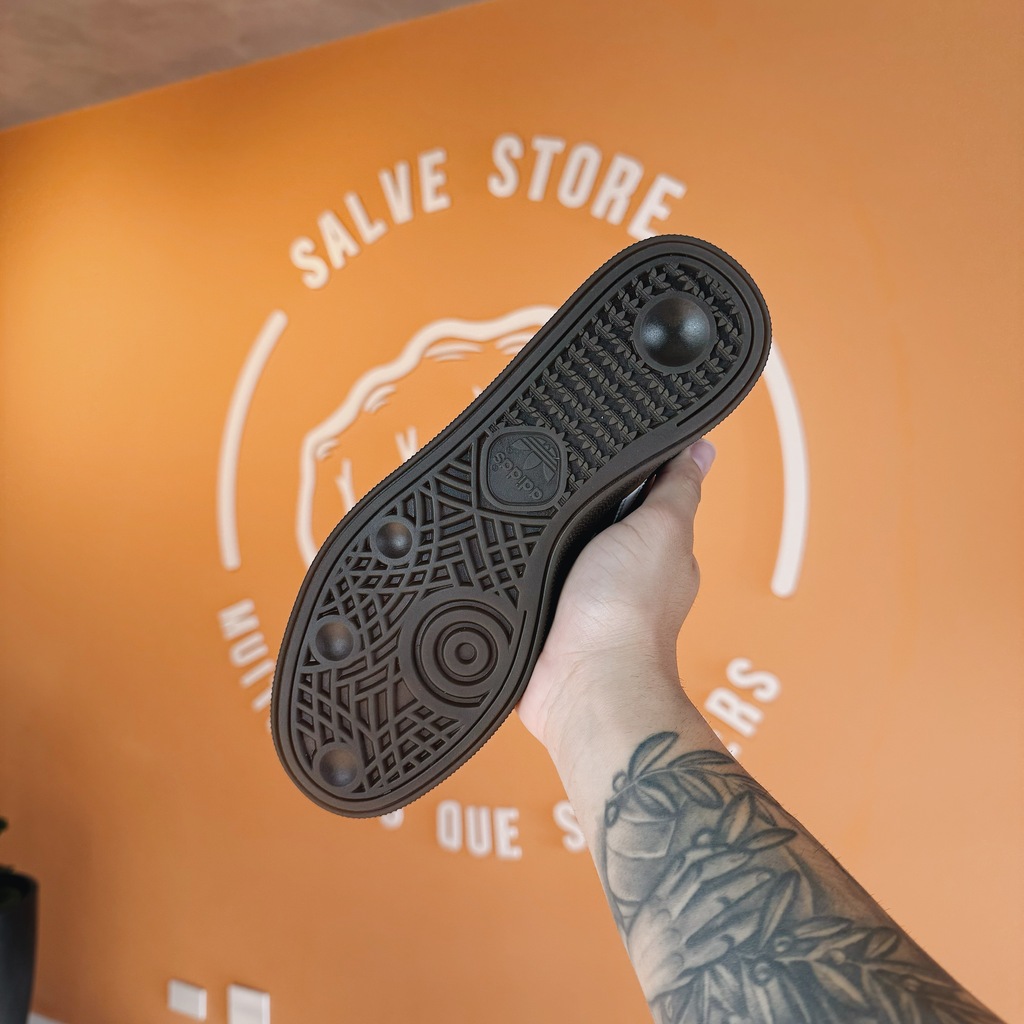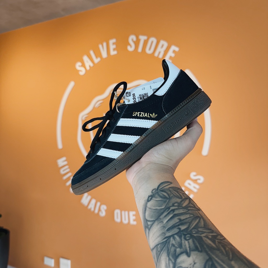 Com um cabedal de camurça preta, esse sneaker ganha destaque com as clássicas três listras em couro branco e o logo “Spezial” dourado na lateral, trazendo um toque sofisticado e discreto.