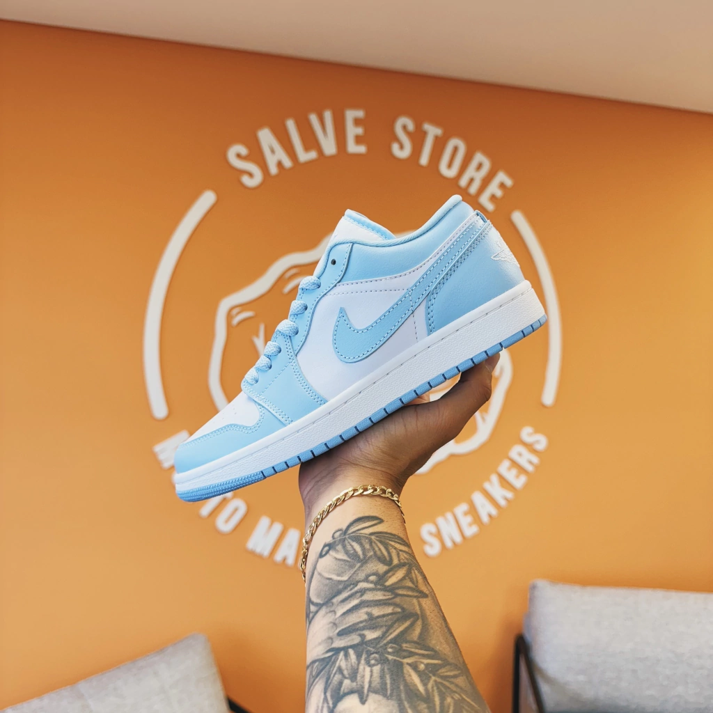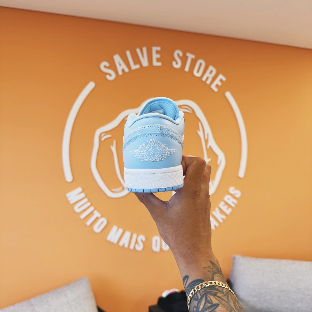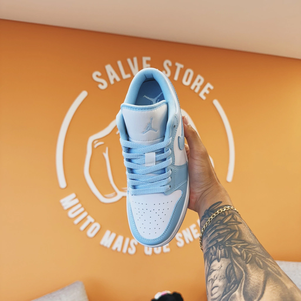 Eleve seu estilo com o Air Jordan 1 Low White Ice Blue — o sneaker que traduz elegância e versatilidade em cada detalhe.