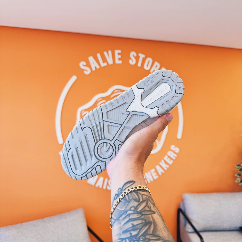 O New Balance 550 White Grey apresenta cabedal de couro branco com sobreposições monocromáticas de couro perfurado e logotipos New Balance espalhados por todo o sneaker.