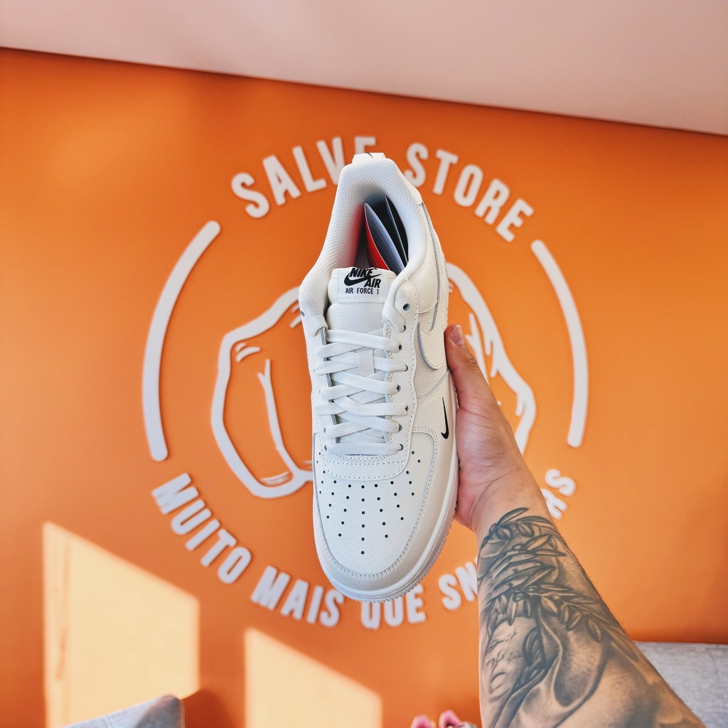 Imagine só: cabedal de couro off white tão elegante que até seu chefe vai querer um igual. As costuras são reforçadas, porque moda boa é moda que dura várias temporadas – e várias baladas. O toque secreto? O mini swoosh bordado em preto na lateral, aquele detalhe que faz todo sneakerhead suspirar e os curiosos perguntarem: “onde você comprou?”